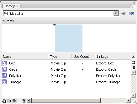 First we have the Primitives.swf file. It will act as our “MovieClip library”. Its library consists of four movieclips, Box, Circle, Polystar and Triangle, each with its linkage class set to its library name: